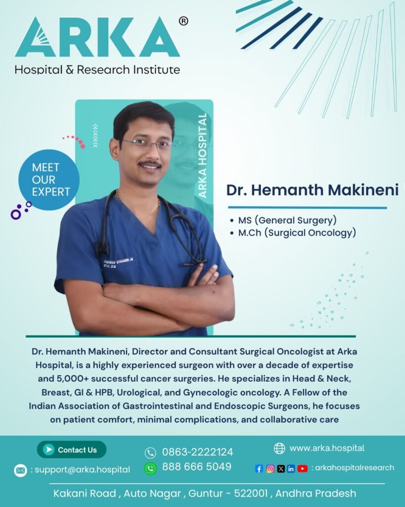 Expert Cancer Surgery. Compassionate Care. Proven Outcomes. When it comes to expert cancer surgery in Guntur, Dr. Hemanth Makineni stands as one of the most trusted and accomplished names in the field of Surgical Oncology. As the Director and Consultant Surgical Oncologist at Arka Hospital & Research Institute, Dr. Makineni has dedicated his career to providing advanced, compassionate, and […]